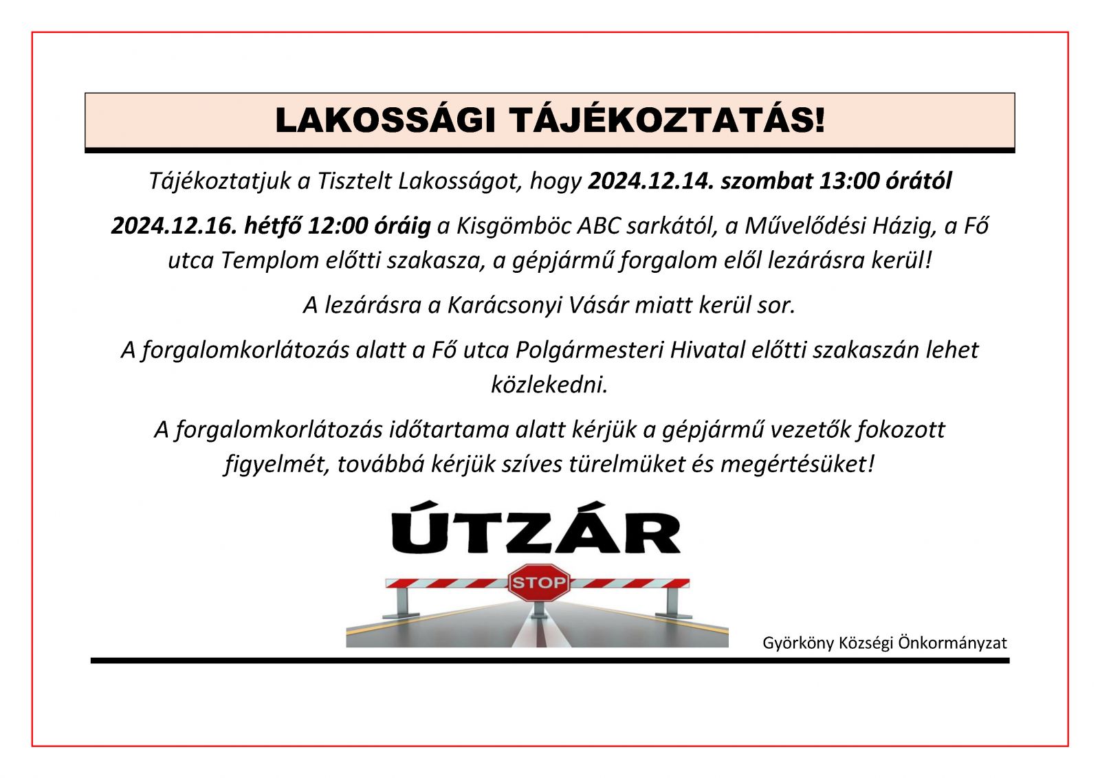 Lakossági tájékoztatás útlezárásról