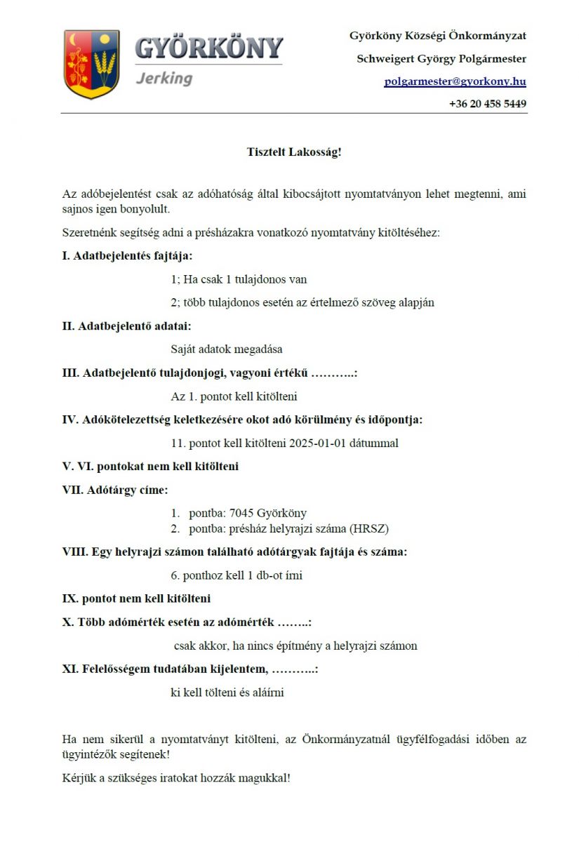 Hirdetmény a présházakkal kapcsolatos adóbejelentéshez